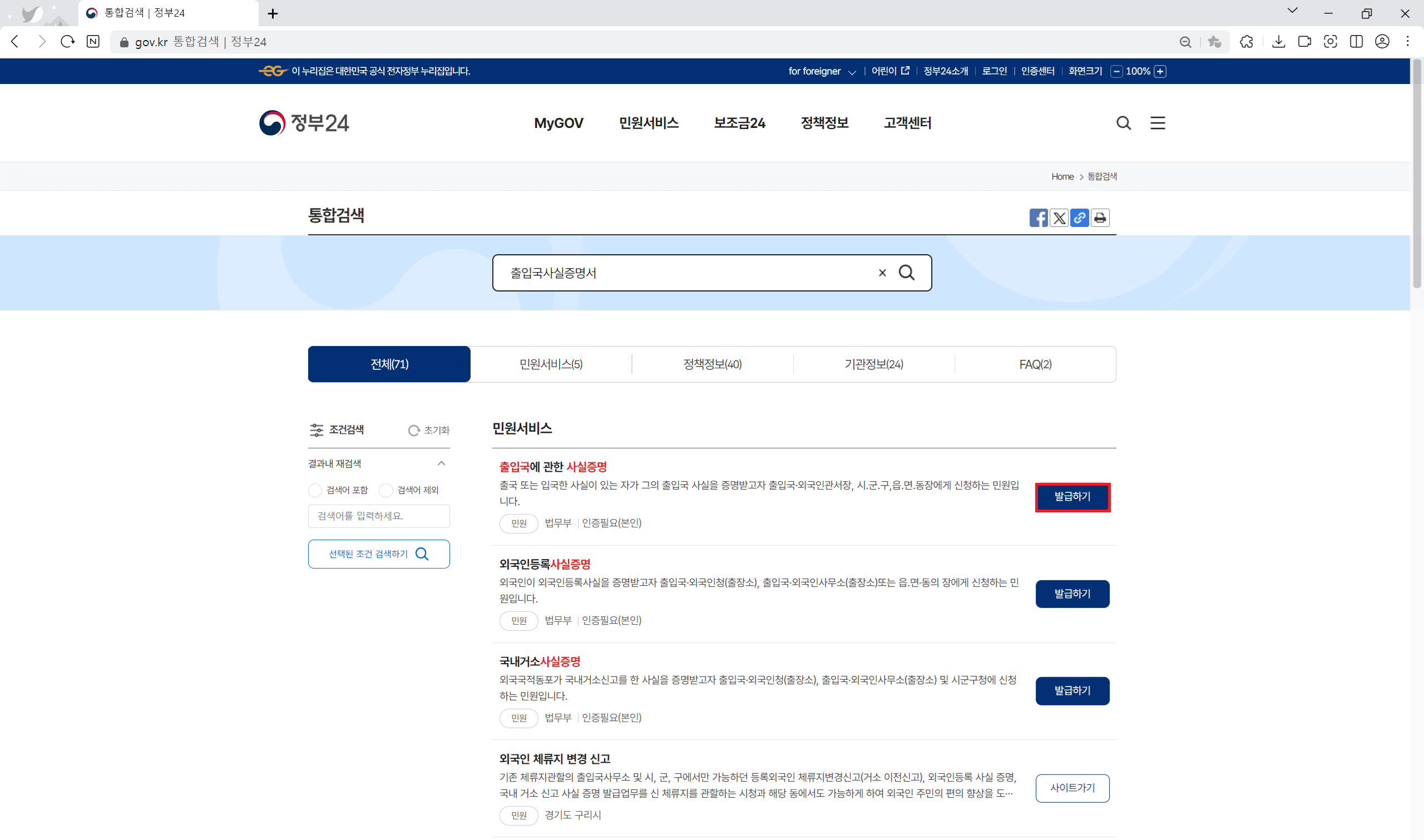 2️⃣ 출입국사실증명서를 검색 후 민원서비스에서 [발급하기]를 클릭합니다.