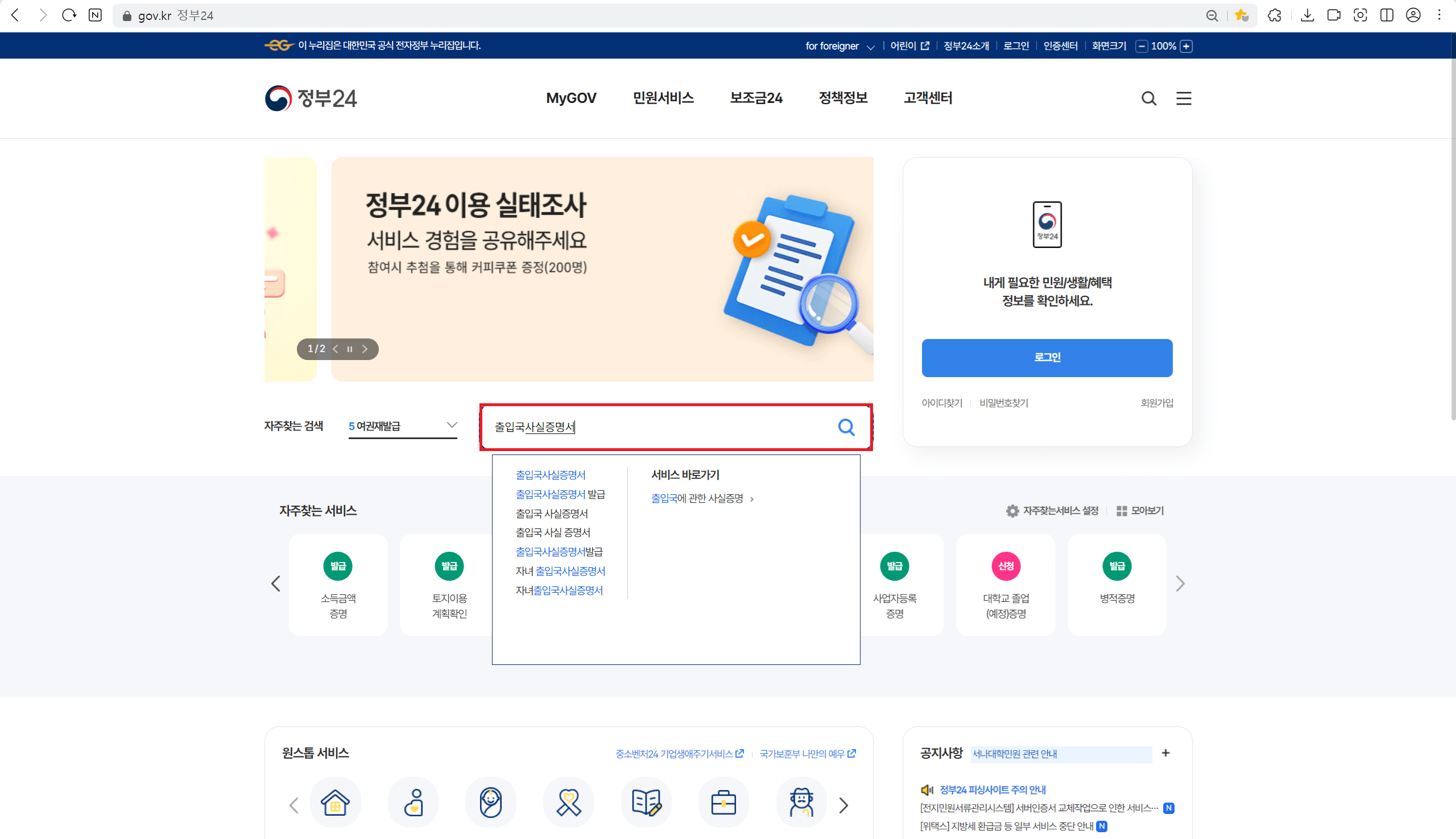 1️⃣ 정부24 사이트에 들어가서 회원가입 및 로그인합니다.